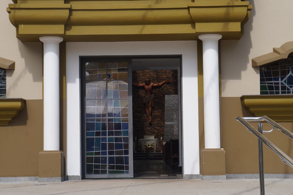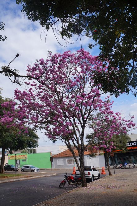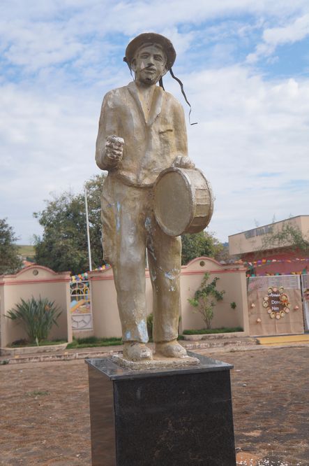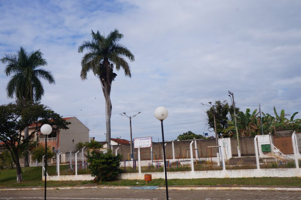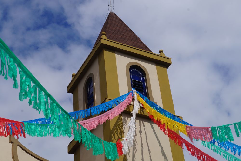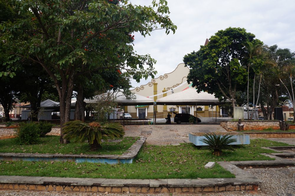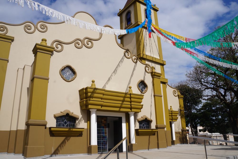 Confira nas fotos a estátua do Congadeiro e ao fundo CEMEI Dona Nem no Arraiá, Praça do Congo com coreto, capela e barracão, Ypê Roxo florido na Praça Monsenhor Ernesto Cavichiolli, Igreja Matriz Santa Teresinha do Menino Jesus enfeitada para o Arraiá da Teresinha, Prefeitura Municipal, Câmara Municipal e Pronto Socorro.
