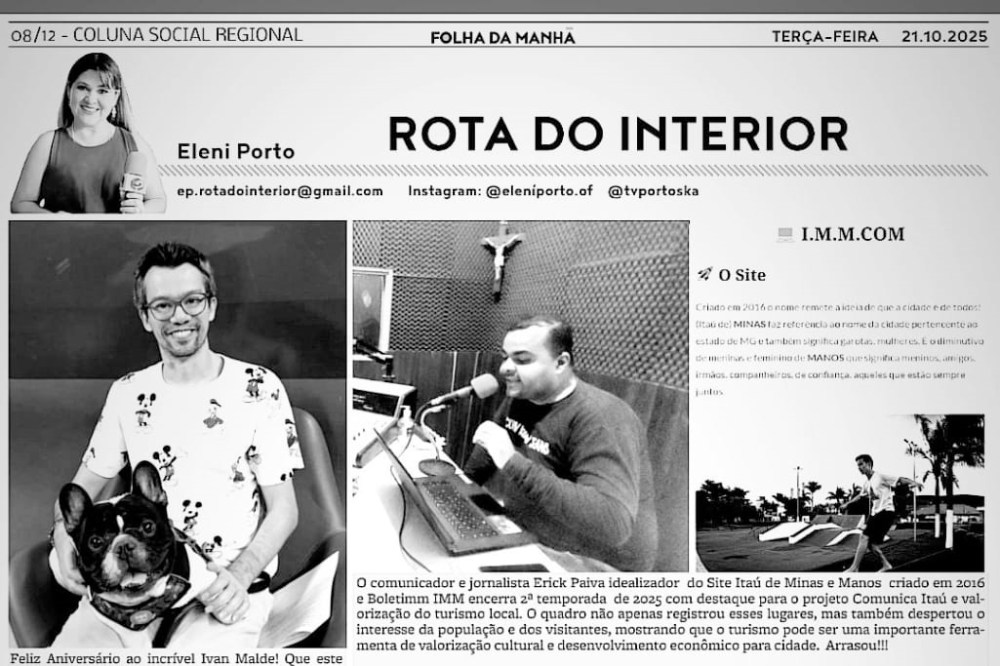 O BOLETIMM #16 do site Itaú de Minas e Manos foi ao ar direto da Rádio Boa Nova 105,9 FM no dia 28 de novembro de 2024, com a participação especial de Knuckles (Lincon Amorim). A edição manteve o estilo dinâmico e participativo do projeto, misturando informação, música e cultura local. No quadro “IMM Dicas”, o boletim valorizou o comércio e os serviços de Itaú de Minas, reforçando o incentivo à economia comunitária. A “Agenda IMM” trouxe destaque para o evento Nárnia e outros. O programa convidou o público a ouvir, compartilhar e fortalecer a comunicação feita pela própria comunidade. Com esse episódio, o Itaú de Minas e Manos reafirma seu compromisso em dar voz e visibilidade à cena cultural e social da cidade.